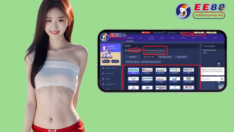 Khi ee88 đăng nhập, người chơi có thể lựa chọn nhiều hình thức nạp tiền khác nhau, tùy theo sự tiện lợi và nhu cầu cá nhân. Dù bạn sử dụng ngân hàng truyền thống hay ví điện tử, EE88 đều có phương án phù hợp.
